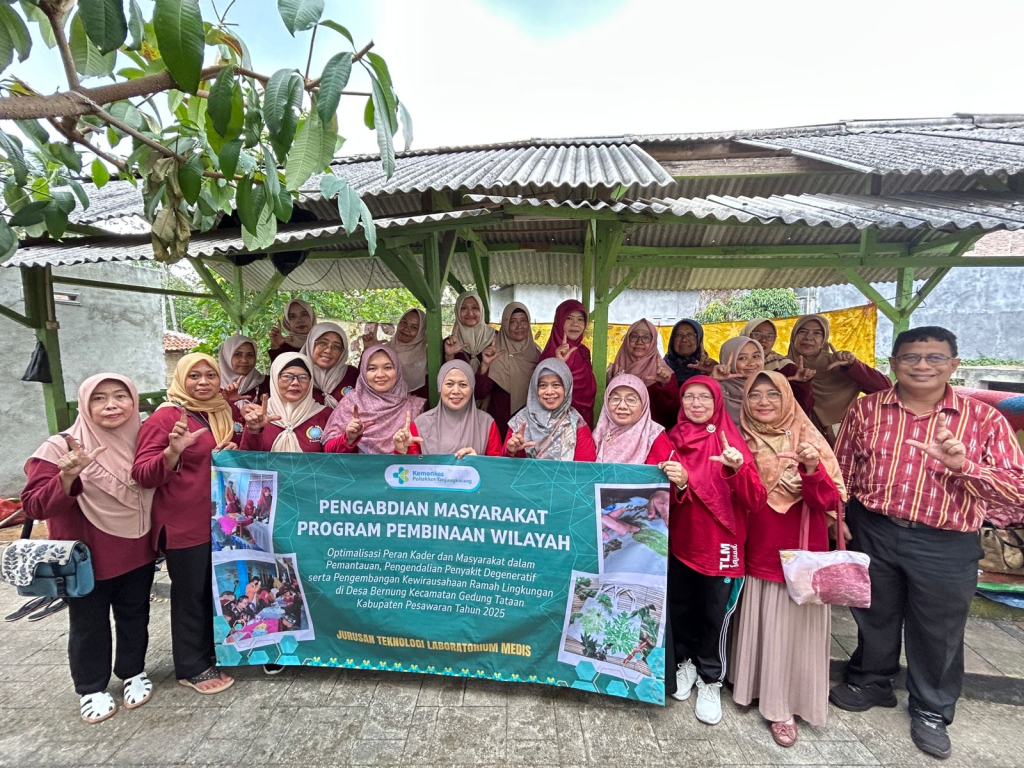 Pesawaran — Sebanyak 17 dosen Jurusan Teknologi Laboratorium Medis melaksanakan kegiatan Pengabdian kepada Masyarakat (PkM) dalam program Pembinaan Wilayah di Desa Bernung, Kecamatan Gedong Tataan, Kabupaten Pesawaran. Kegiatan ini berfokus pada pemeriksaan kesehatan dan skrining penyakit degeneratif, meliputi pemeriksaan tekanan darah, kadar glukosa darah, kolesterol, dan asam urat, serta pelatihan kewirausahaan ramah lingkungan melalui teknik eco-printing.